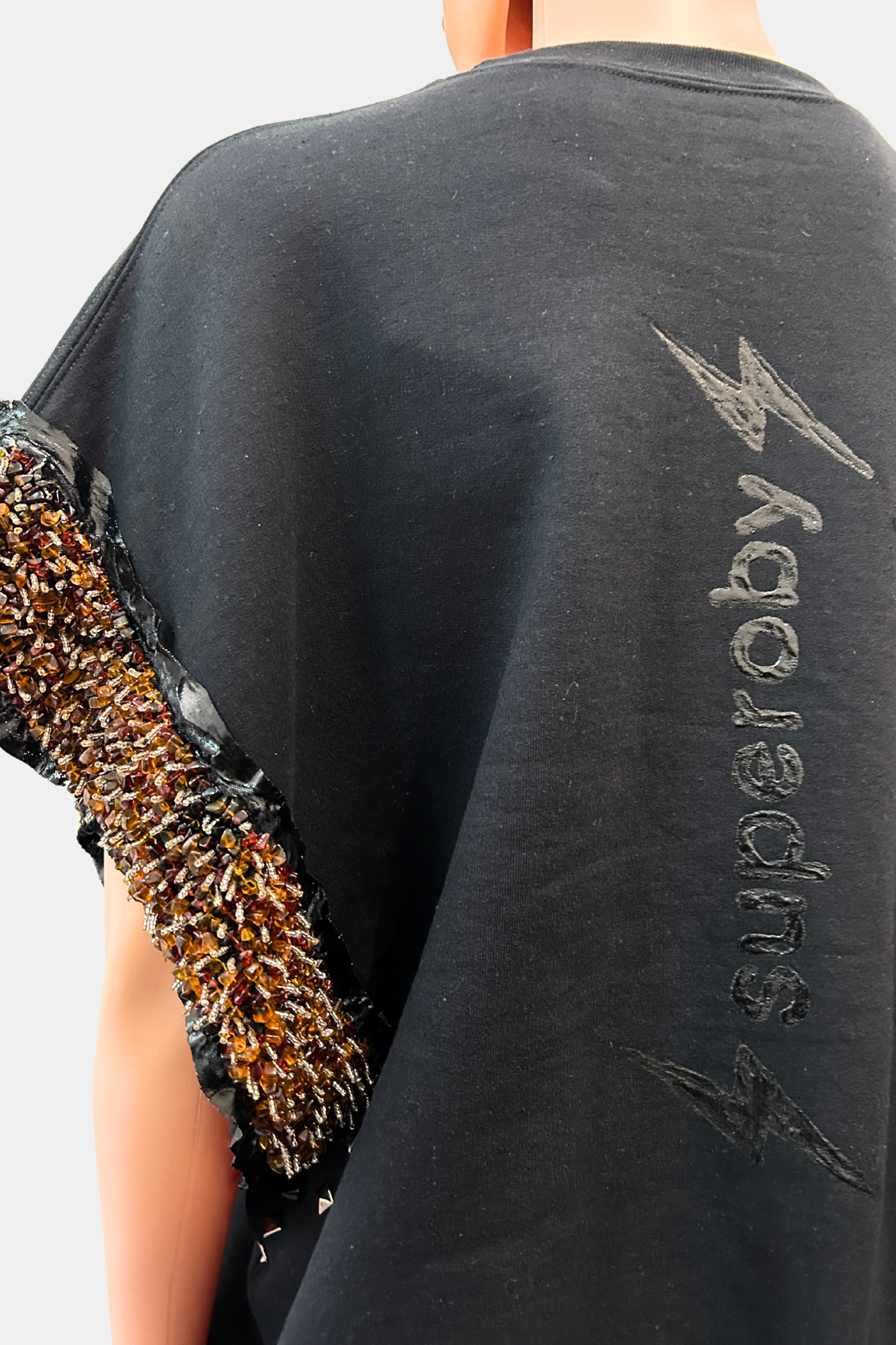 In the Hand-painted & Embroidery collection, you will find not only hand-painted but also embroidered pieces. These pieces can be made using upcycling or deadstock materials. Our team is dedicated to recovering and recycling embroidery, pearls, stones, metals, lace, accessories, shoe straps, pins, earrings and pieces of clothing from flea markets, brocantes and old haberdashery. These elements are combined with a casual punk touch to create unique and exceptional pieces.